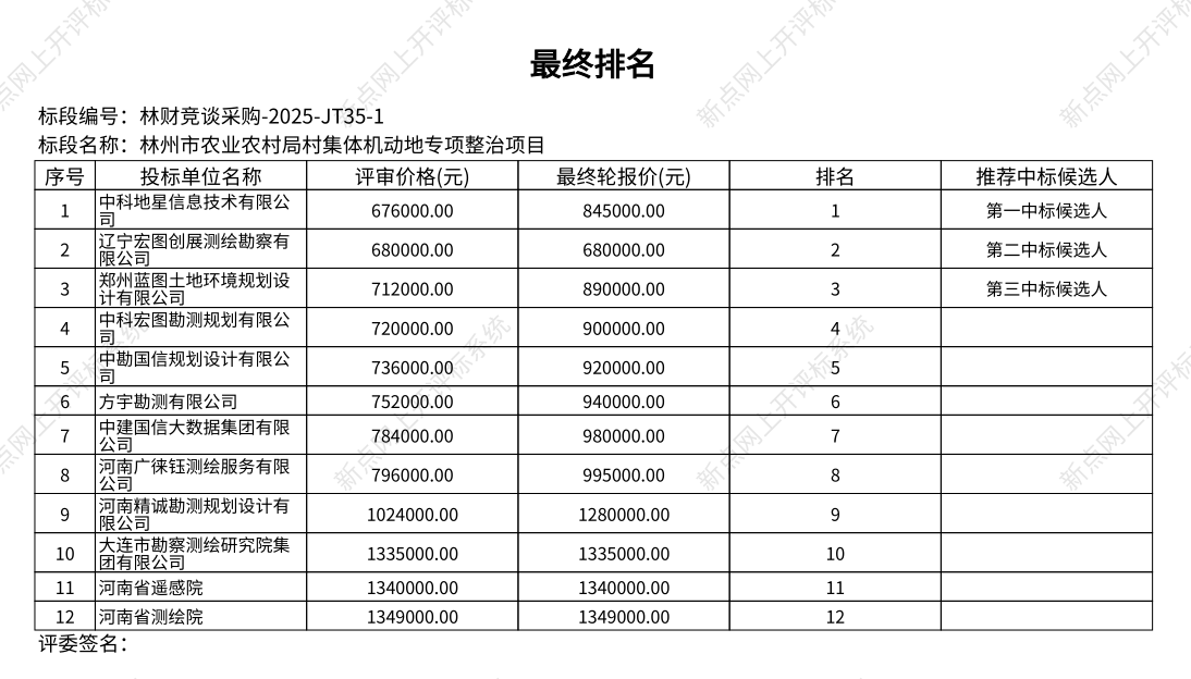 林财竞谈采购-2025-JT35-1 ******有限公司 郑州市金水区花园路27号河南省科技信息大厦21层2105号 845,000.00 评审价格:845000元